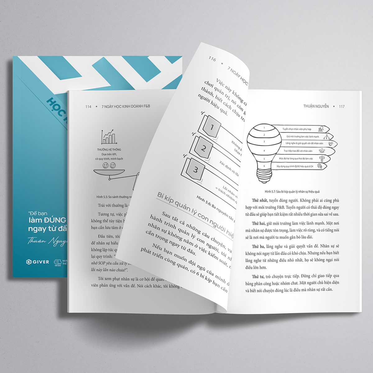 Chương 5: Quản lý con người, làm đúng trước truyền cảm hứng sau. Chủ quán cần nắm được cách tuyển chọn đúng người cho đúng vị trí, đào tạo nhân sự hiệu quả ngay từ đầu, và xây dựng một hệ thống đánh giá công bằng, rõ ràng. Việc quản trị con người không thể dựa vào cảm tính hay trực giác nhất thời, mà cần được thiết kế trên nền tảng hệ thống và những hành vi cụ thể trong công việc.